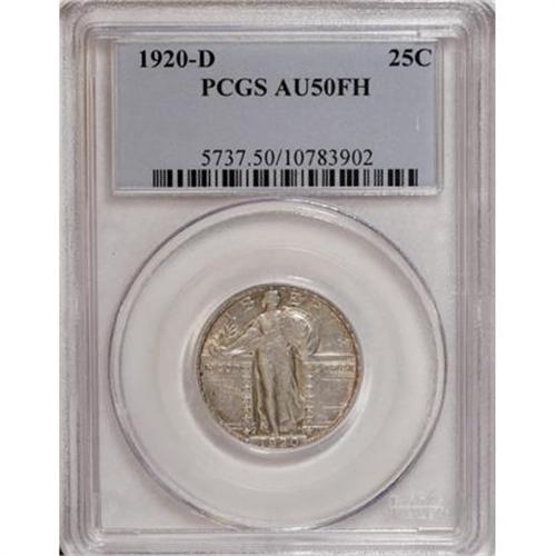 <B>1920-D 25C AU50 Full Head PCGS.</B></I> Liberty's head and shield rivets are nearly complete, save for traces of wear. The steel-gray surfaces exhibit slight amounts of russet and lilac color near the borders. A few wispy hairlines are noted in the reverse fields. <BR><BR><B>Coin Engraver:</B> Hermon A. MacNeil<BR><BR><b>Shipping:</b> Coins & Currency (<a target="_blank" href="http://www.heritageauctions.com/common/shipping.php">view shipping information</a>)