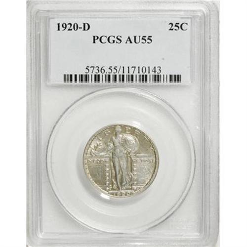 <B>1920-D 25C AU55 PCGS.</B></I> PCGS Population (14/239). NGC Census: (8/142). Mintage: 3,586,400. Numismedia Wsl. Price for NGC/PCGS coin in AU55: $171. (#5736)<BR><BR><B>Coin Engraver:</B> Hermon A. MacNeil<BR><BR><b>Shipping:</b> Coins & Currency (<a target="_blank" href="http://www.heritageauctions.com/common/shipping.php">view shipping information</a>)