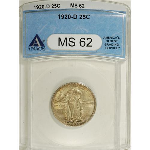 <B>1920-D 25C MS62 ANACS.</B></I> NGC Census: (20/216). PCGS Population (19/174). Mintage: 3,586,400. Numismedia Wsl. Price for NGC/PCGS coin in MS62: $325. (#5736)<BR><BR><b>Shipping:</b> Coins & Currency (<a target="_blank" href="http://www.heritageauctions.com/common/shipping.php">view shipping information</a>)