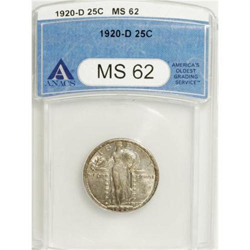 <B>1920-D 25C MS62 ANACS.</B></I> NGC Census: (11/108). PCGS Population (19/179). Mintage: 3,586,400. Numismedia Wsl. Price for NGC/PCGS coin in MS62: $325. (#5736)<BR><BR><B>Coin Engraver:</B> Hermon A. MacNeil<BR><BR><b>Shipping:</b> Coins & Currency (<a target="_blank" href="http://www.heritageauctions.com/common/shipping.php">view shipping information</a>)