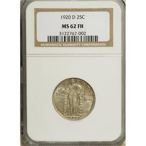 <B>1920-D 25C MS62 Full Head NGC.</B></I> Delicate gold, peach, and orange patina graces the softly shimmering surfaces of this uncommonly well-defined Denver quarter. Though wispy flaws preclude a finer designation, this coin's eye appeal is undeniable. Census: 15 in 62 Full Head, 53 finer (2/08).<BR><BR><B>Coin Engraver:</B> Hermon A. MacNeil<BR><BR><b>Shipping:</b> Coins & Currency (<a target="_blank" href="http://www.heritageauctions.com/common/shipping.php">view shipping information</a>)