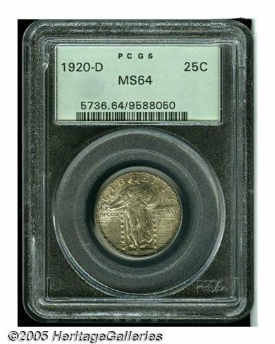 <B>1920-D<25C> MS64 PCGS.</B></I> Dusky dove-gray color endows the obverse, while the reverse is only faintly toned. The center of the head and the top of the date show slight striking softness. A couple of faint marks are on the lower reverse field. Housed in a prior generation holder.<BR><I>From The Stig Ericsson Collection.</B></I>