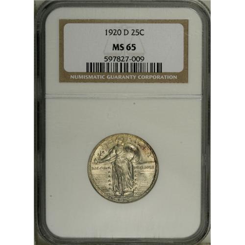 <B>1920-D 25C MS65 NGC.</B></I> The lustrous surfaces are lightly toned on the obverse with green-gray coloration on the reverse. A small mark is noted on the upper part of Liberty's right leg. Census: 22 in 65, 14 finer (12/06).<BR><BR><b>Shipping:</b> Coin/Currency (<a target="_blank" href="http://www.heritageauctions.com/common/shipping.php">view shipping information</a>)