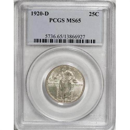 <B>1920-D 25C MS65 PCGS.</B></I> A well struck and strongly lustrous Gem example, subtly toned ice-blue on the obverse with a veil of apricot-gold patina over the reverse. Carefully preserved with excellent eye appeal. Population: 34 in 65, 23 finer (6/07).<BR><BR><B>Coin Engraver:</B> Hermon A. MacNeil<BR><BR><b>Shipping:</b> Coins & Currency (<a target="_blank" href="http://www.heritageauctions.com/common/shipping.php">view shipping information</a>\)