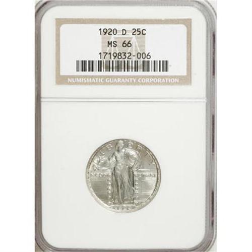 <B>1920-D 25C MS66 NGC.</B></I> This is a lovely Premium Gem with untoned silver-white surfaces and pleasing luster. Well preserved and essentially blemish-free, save for a couple of insignificant, nearly microscopic marks on each side. A delicate die crack extends through the upper halves of all four numerals in the date. Cline refers to this issue as "very underrated in today's market." Census: 13 in 66, 1 finer (10/07).<BR><I>From The Hoffy Collection, NGC's #3 Registry Collection of Standing Liberty Quarters.</B></I><BR><BR><B>Coin Engraver:</B> Hermon A. MacNeil<BR><BR><b>Shipping:</b> Coins & Currency (<a target="_blank" href="http://www.heritageauctions.com/common/shipping.php">view shipping information</a>)