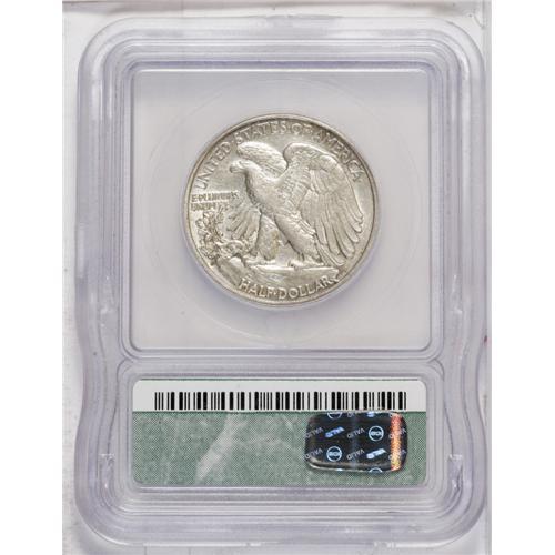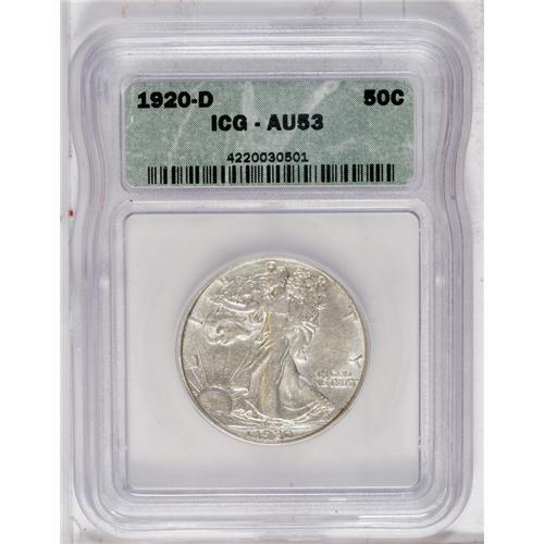 <B>1920-D<50C> AU53 ICG.</B></I> A nicely struck piece with light wear over the highpoints. Pale reddish toning appears over the still-lustrous fields, which show a few marks from light circulation.