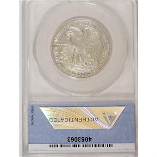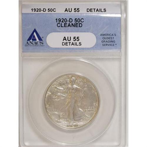 <B>1920-D 50C --Cleaned--ANACS. AU55 Details.</B></I> Delicate powder-blue and caramel-gold toning. This scarcer early branch mint Walking Liberty half displays faint hairlines, and a loupe reveals a few areas of fine abrasions. Ample luster shimmers from the design.<BR><BR><B>Coin Engraver:</B> Adolph A. Weinman<BR><BR><b>Shipping:</b> Coins & Currency (<a target="_blank" href="http://www.heritageauctions.com/common/shipping.php">view shipping information</a>)