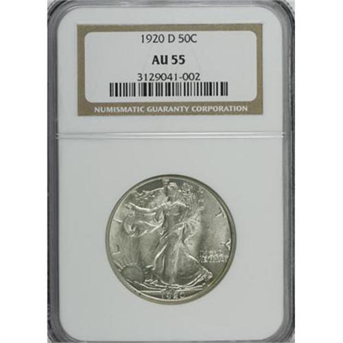 <B>1920-D 50C AU55 NGC.</B></I> Well struck overall, though Liberty's branch hand shows little definition. Strong, pleasing luster with hints of golden peripheral toning and only a trace of wear.<BR><BR><B>Coin Engraver:</B> Adolph A. Weinman<BR><BR><b>Shipping:</b> Coins & Currency (<a target="_blank" href="http://www.heritageauctions.com/common/shipping.php">view shipping information</a>)