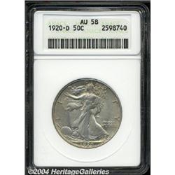 <B>1920-D<50C> AU58 ANACS.</B></I> Light rose toning overlays smooth surfaces. Just a smidgen too much friction on the highpoints keeps this coin from Mint State status.<BR><I>From the Virgil Farstad Collection, Part Two.</B></I> <BR><BR><B>Important notice:</B> Heritage usually auctions material at the rate of 200-250 lots per hour. On some occasions eBay Live bid software or the Internet may not be able to keep up with the pace of the auction. We recommend placing a realistic absentee bid now as insurance to avoid disappointment. Occasionally the auctioneer may eliminate or reject an eBay Live bid, and the auctioneer may also reopen a lot after the close of the eBay live bidding (usually because we missed an audience bid), and may reject your bid even if it shows you as the winning bidder. By bidding via eBay Live, you agree that Heritage may award the lot to another bidder at its sole discretion under the circumstances described above or any other reasonable circumstances. Since eBay bids are not shown to us until we open the lot on the floor, we treat those bids just like floor bids. In most cases the floor responds before the eBay bid is presented to us, due to Internet lag time, so for consistency we have made it a policy that floor bids are always considered first over tie eBay live bids. Also please note that all Heritage lots purchased through eBay Live carry a 20% Buyer's Premium. Please make sure you read the Terms and Conditions before you bid.