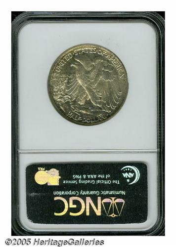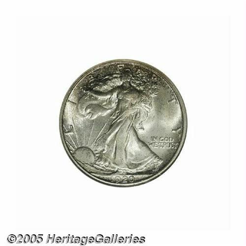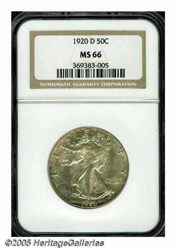 <B>1920-D<50C> MS66 NGC.</B></I> This is a delightful Gem example even though it is not fully struck. In his guide to the series, Bruce Fox commented: "Records show ample dies were available, but low striking pressures and/or inadequate die spacing produced weaker than average strikes. This was typical of the Denver Mint up until the late thirties." The surfaces have wonderful satiny luster with speckled golden-brown toning. Overall, this example has a high degree of eye appeal. It is the single finest example of the date certified by NGC. PCGS has graded just six of them, but that total probably includes a couple resubmissions. This is only the fourth time we have handled an MS66 grade example of this date in 12 years. Population: 1 in 66, 0 finer (6/05).<BR><I>From The Robert Moreno Collection.</B></I>