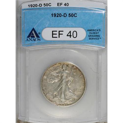 <B>1920-D 50C XF40 ANACS.</B></I> NGC Census: (5/157). PCGS Population (7/267). Mintage: 1,551,000. Numismedia Wsl. Price for NGC/PCGS coin in XF40: $342. (#6581)<BR><BR><B>Coin Engraver:</B> Adolph A. Weinman<BR><BR><b>Shipping:</b> Coins & Currency (<a target="_blank" href="http://www.heritageauctions.com/common/shipping.php">view shipping information</a>)