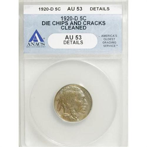 <B>1920-D 5C --Cleaned, Die Chips and Cracks--ANACS. AU53 Details.</B></I> NGC Census: (5/326). PCGS Population (10/471). Mintage: 9,418,000. Numismedia Wsl. Price for NGC/PCGS coin in AU53: $250. (#3945)<BR><BR><B>Coin Engraver:</B> James E. Fraser<BR><BR><b>Shipping:</b> Coins & Currency (<a target="_blank" href="http://www.heritageauctions.com/common/shipping.php">view shipping information</a>)