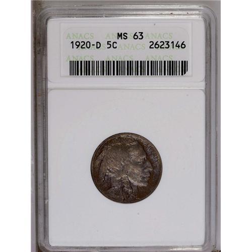 <B>1920-D<5C> MS63 ANACS.</B></I> The right reverse rim features three mint-made die breaks. Honey-gold and steel-blue patina enrich this shimmering and suitably struck nickel. The bottom of the ANACS holder has a slender piece missing, which has no effect on the preservation of the coin itself.