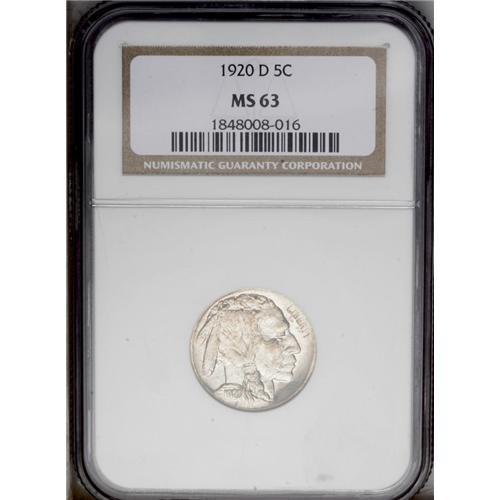 1920-D 5C MS63 NGC. Bright and lustrous, with a bold s 1920-D[5C] MS63 NGC.