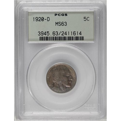 <B>1920-D<5C> MS63 PCGS.</B></I> Boldly struck with minor weakness evident near the obverse center, as well as on the bison's head and shoulder. The medium-gray surfaces display bright violet accents on each side. Nicely preserved and blemish-free, a visually pleasing example housed in a green label PCGS holder.