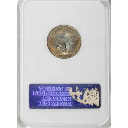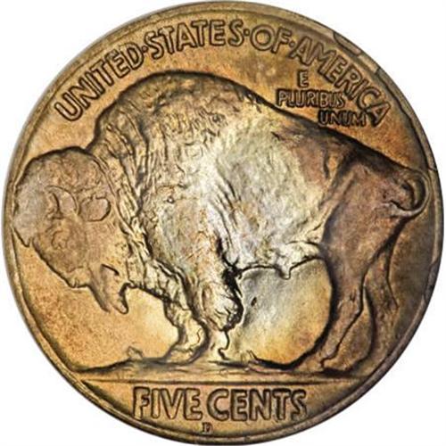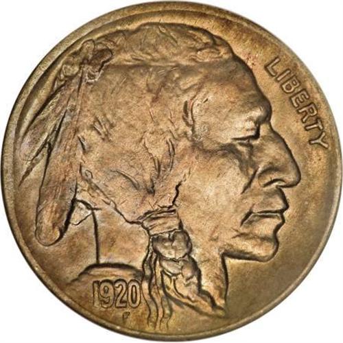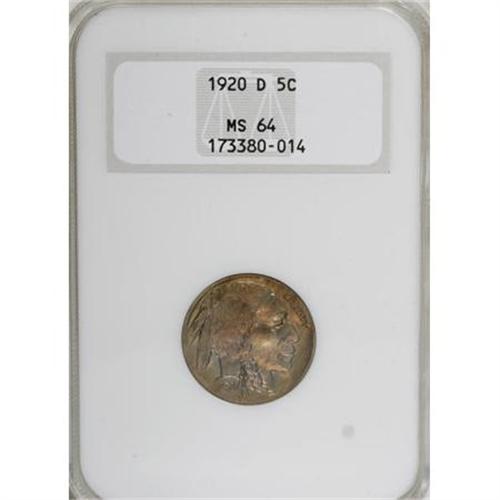 <B>1920-D 5C MS64 NGC.</B></I> Burnt-orange and lime endow this shimmering near-Gem, although a window of brilliance is present on the bison's flank. Unabraded and attractive with a bold tail and LIBERTY. Slightly soft near 9 o'clock on each side, and a slender lamination is beneath the upper feather. Specialists may be interested in the three rim cuds on the reverse between 1 and 3 o'clock. Certified in a prior generation holder.<BR><BR><B>Coin Engraver:</B> James E. Fraser<BR><BR><b>Shipping:</b> Coins & Currency (<a target="_blank" href="http://www.heritageauctions.com/common/shipping.php">view shipping information</a>)