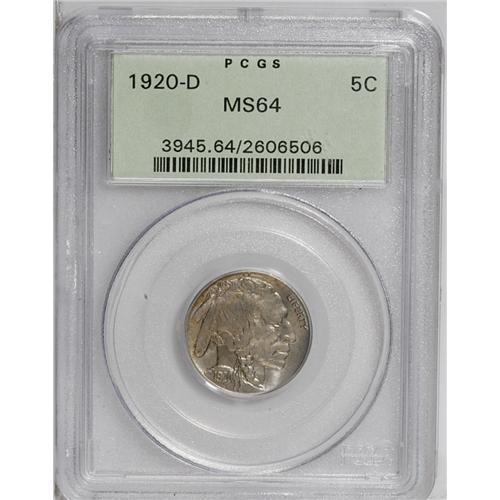 <B>1920-D<5C> MS64 PCGS.</B></I> Steel-gray and apricot tints enrich this satiny and unmarked near-Gem. Peripheral elements such as the tail, date, mintmark, and LIBERTY are needle-sharp. The centers and the bison's hair show some softness. The 1920-D is scarce in Mint State, despite a relatively plentiful production. Encapsulated in an older green label holder.