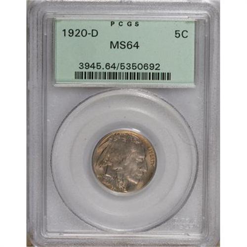 <B>1920-D 5C MS64 PCGS.</B></I> Lilac and khaki-gold toning embrace this attractive branch mint Buffalo nickel. The reverse appears immaculate, and the obverse has only a few minute ticks. Well struck aside from the bison's hair. Encapsulated in a green label holder.<BR><BR><b>Shipping:</b> Coins & Currency (<a target="_blank" href="http://www.heritageauctions.com/common/shipping.php">view shipping information</a>)