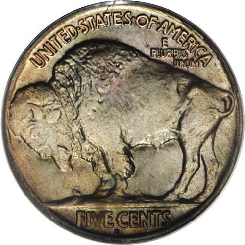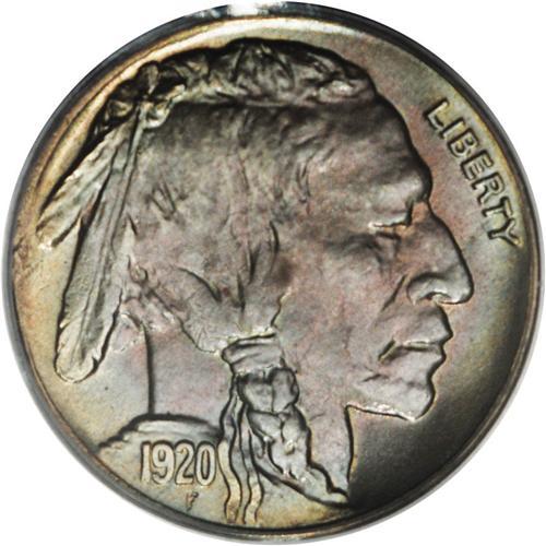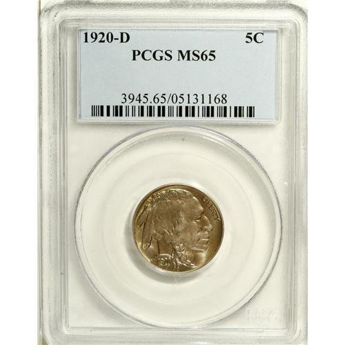<B>1920-D 5C MS65 PCGS.</B></I> Surprisingly difficult to acquire in this grade and practically impossible to find any finer. Crescents of greenish-gold patina haunt the left obverse and reverse rims, and blue-violet toning covers the remainder of this glowing and typically struck Gem. The surfaces are surprisingly clean. Population: 46 in 65, 1 finer (12/06).<BR><BR><b>Shipping:</b> Coin/Currency (<a target="_blank" href="http://www.heritageauctions.com/common/shipping.php">view shipping information</a>)
