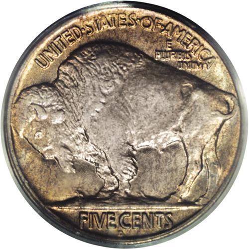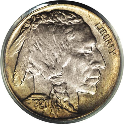 <B>1920-D<5C> MS65 PCGS.</B></I> The 1920-D is a scarce coin in the higher circulated grades and in all Mint State grades. In full Gem and finer condition, no more than 60 examples have been certified by PCGS and NGC combined. Buffalo nickel specialist David Lange (2000) writes that the '20-D exhibits a general softness which is most pronounced at the bison's right hind leg and tail. The specimen offered in this lot does not fit this generalization, as both of these elements are relatively well defined. Moreover, the date and LIBERTY are bold, as is the horn, while minor softness is noted in portions of the bison's hair. Bright lustrous surfaces exhibit low intensity champagne toning with lavender peripheral accents on the obverse, and slightly deeper hues of champagne, lavender, and sky-blue coloration on the reverse. Population: 45 in 65, 1 finer (9/06).