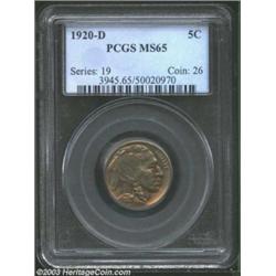 1920-D 5C MS65 PCGS. The 1920-D is a well-known strike and condition rarity from the 1920s and is seldom located in Gem condition. The obverse on this piece is especially well defined with hair definition complete all the way down to the knot in the braid. The reverse, on the other hand, is somewhat soft on the bison's head but the tail is fully split. Rich cinnamon-rose and lilac toning covers the surfaces of this softly frosted, problem-free Gem. Population: 36 in 65, 1 finer (1/03). Important notice: We expect to be auctioning lots at the rate of 200-250 per hour. On occasion eBay live bid software cannot keep up with the pace of the auctions where 4-5 lots per minute can hammer down, so we recommend that you place a realistic absentee bid now as insurance to avoid disappointment. Also please note that all Heritage/CAA lots purchased through eBay Live carry a 20% Buyer's Premium. Please make sure you read the Terms and Conditions.