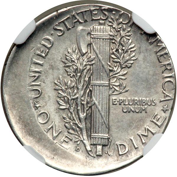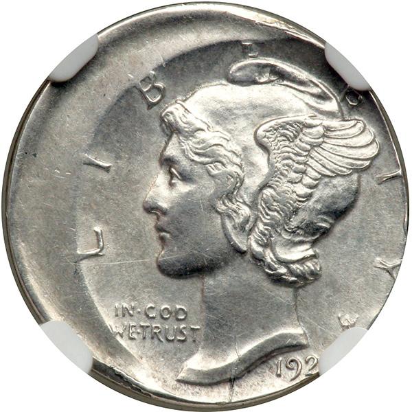 (1920)-D Mercury Dime Struck 15% Off-Center NGC graded Mint Error AU Details. Improperly cleaned but still a smooth, damage-free example and highly prized by collectors of off-center coinage.
