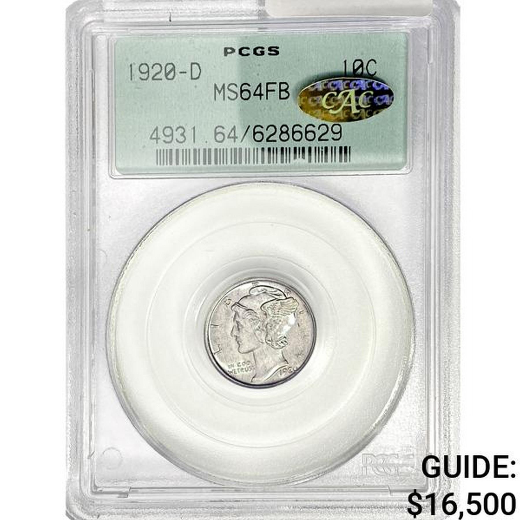 1920-D Mercury Silver Dime PCGS MS64 FB Gold CAC