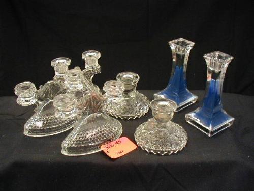 1920 DEPRESSION PRESSED GLASS CANDLE HOLDER LOT INCLUDES, PR. DBL. CANDLE HOLDER OVAL BASE 4 1/2inH 6inW, PR. 3 1/2inH SINGLE CANDLE HOLDERS, PR. SQ. SINGLECANDLE HOLDER 6 1/2inH , (1) DBL. CANDLE HOLDER 4 1/2inH, 7 PCS