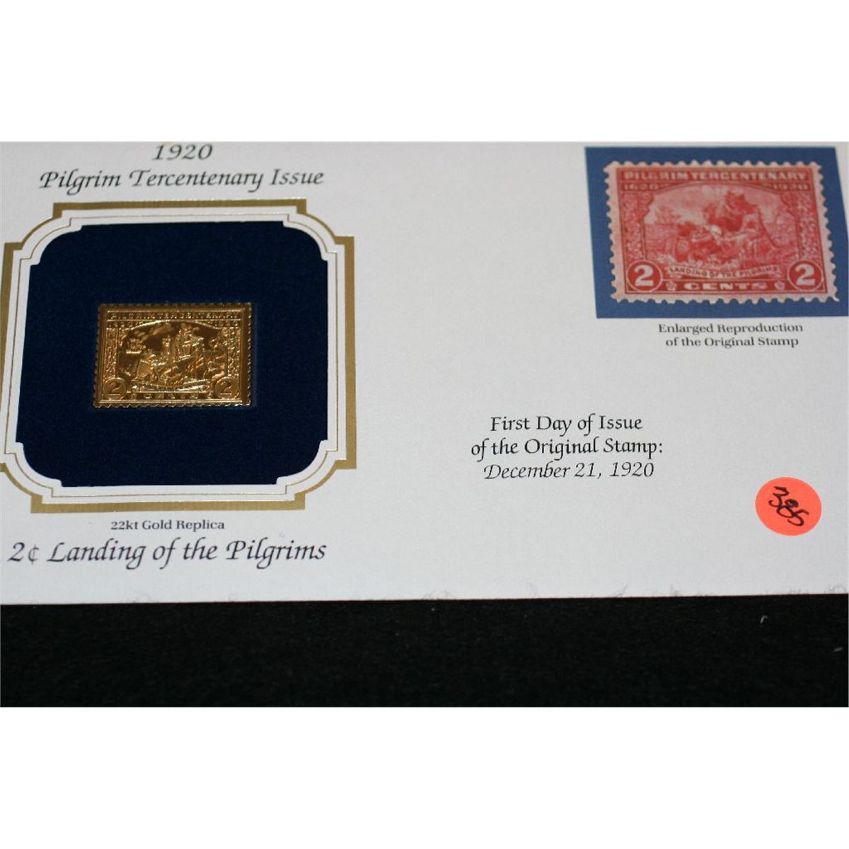 1920 First Day Issue 22K Gold Replica Stamp w/stamps, Two Cent Landing of the Pilgrims
