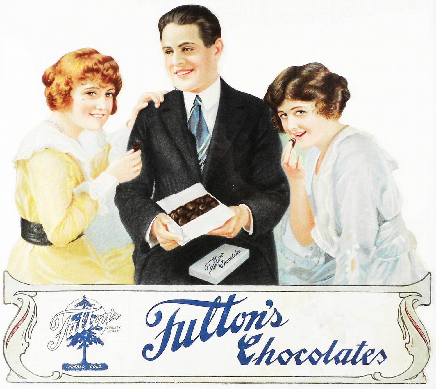 1920 Fulton's Chocolates Die Cut Cardboard Sign, easel back. Pueblo, Colo. Framed under glass. Staining lower right and crease across mans neck otherwise very good condition. 22 1/2 X 20 inches.