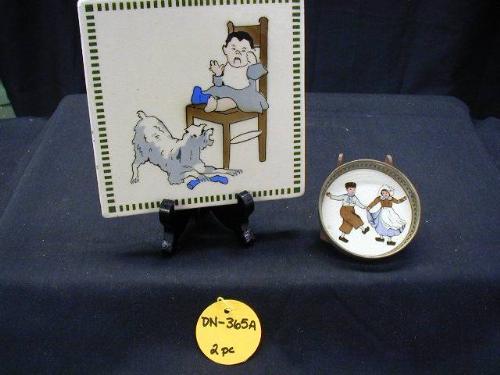 1920 GERMAN INCLUDES (1) ART DECO FIGURE TRIVET STAMPED T.B.I.C. 7468 ^' X 6in SQ. (EDGE & CORNER FLAKES), (1) COASTER FEATURING DUTCH CHILDREN TILE STAMPED GERMANY 6081 EXCELLENT 2 PCS