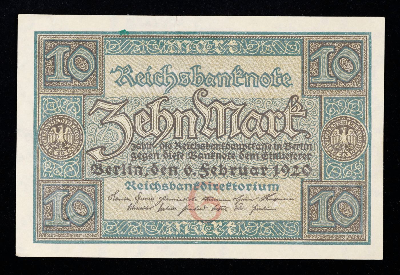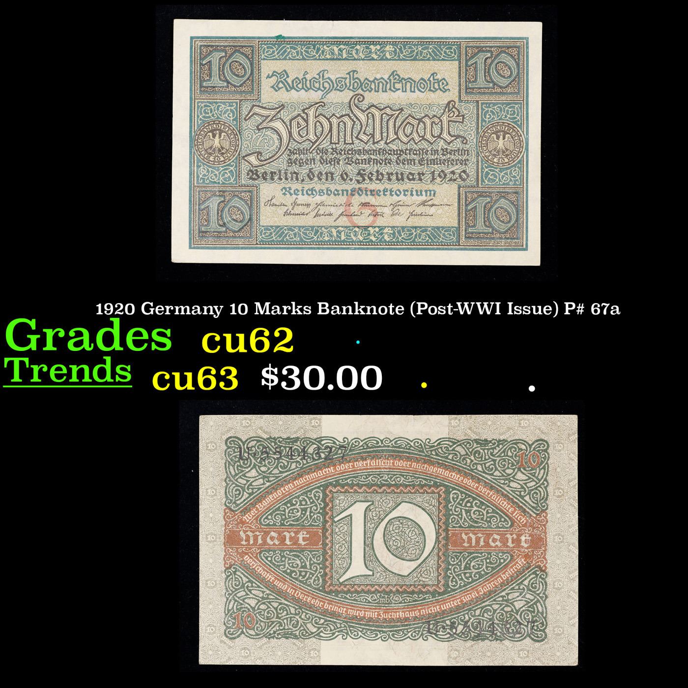 1920 Germany 10 Marks Banknote (Post-WWI Issue) P# 67a Grades Select CU. In the early 1920s, post-WWI Germany saw its economy spiraling out of control. Hyperinflation started directly after the war in 1918, but truly took over the Weimar Republic from 1921 to 1923. The value of the Mark declined incredibly rapidly. 1 USD was equal to 50 German Marks at the beginning of 1920. Toward the end of 1923, 1 USD was equal to over 4,200,000,000,000 German Marks. At times, denominations of the Mark became less valuable than the paper and labor to print it almost immediately after printing. Thus, denominations of the Mark notes became incredibly large, ending up in the tens of trillions.