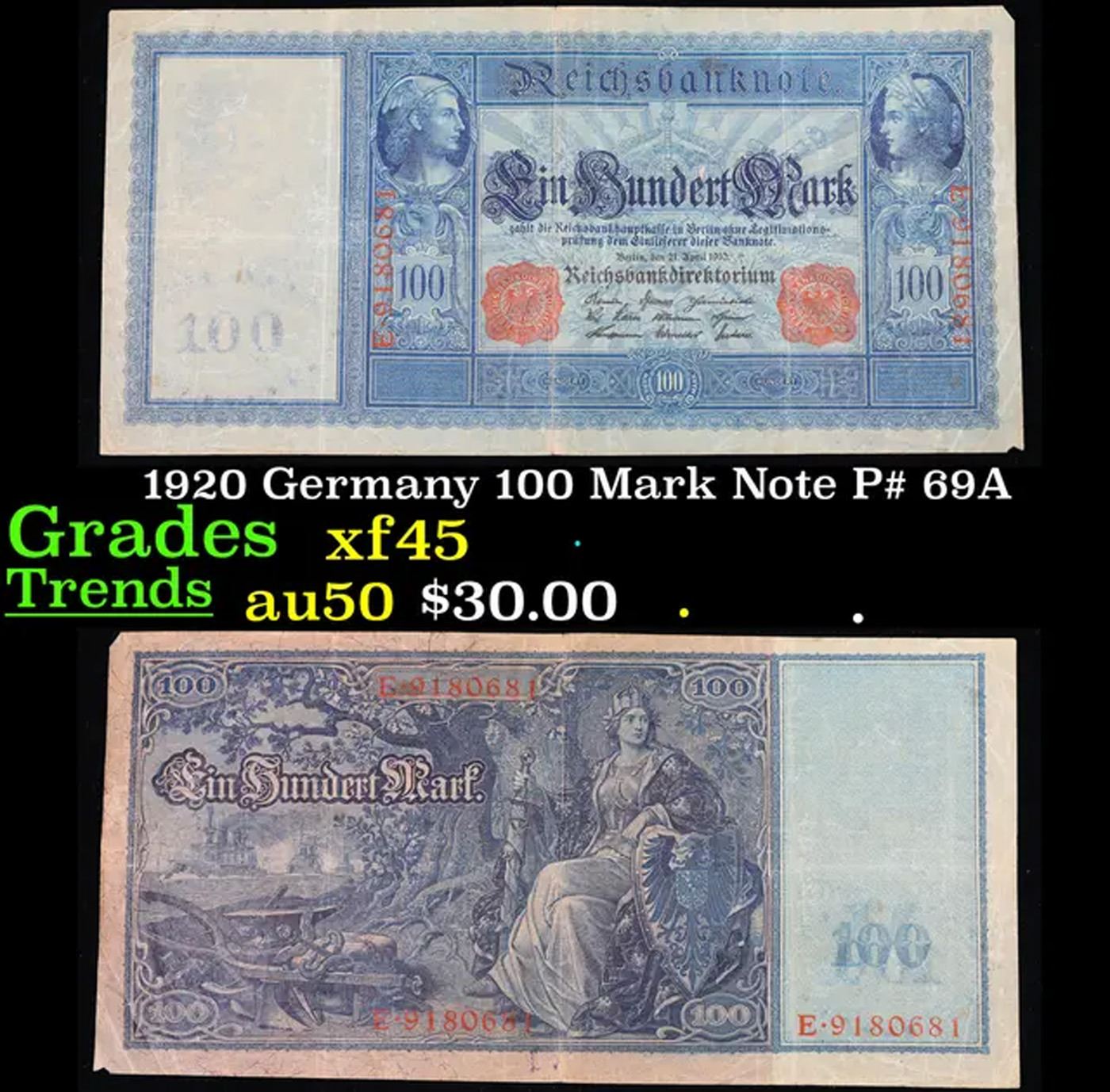 1920 Germany 100 Mark Note P# 69A Grades xf+.