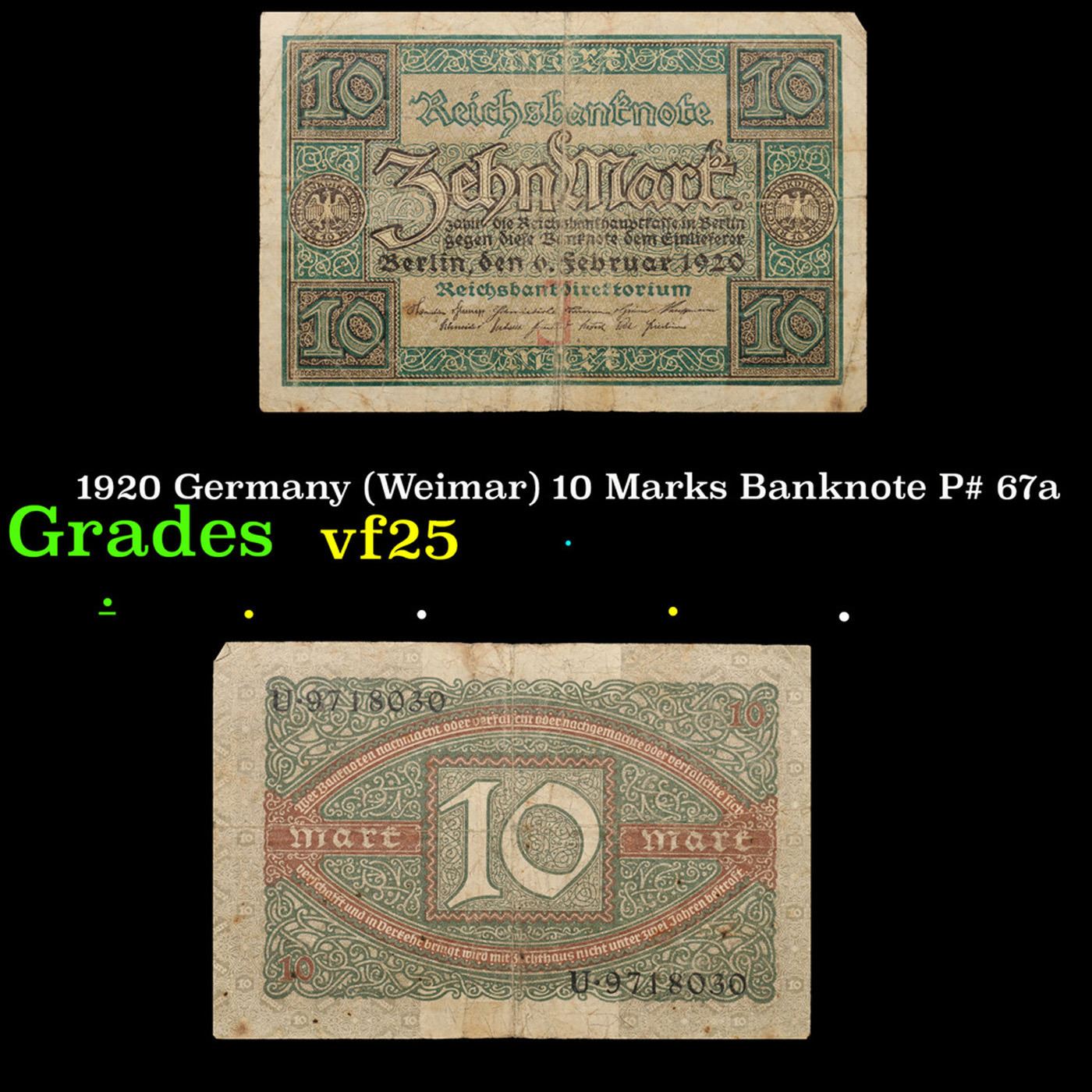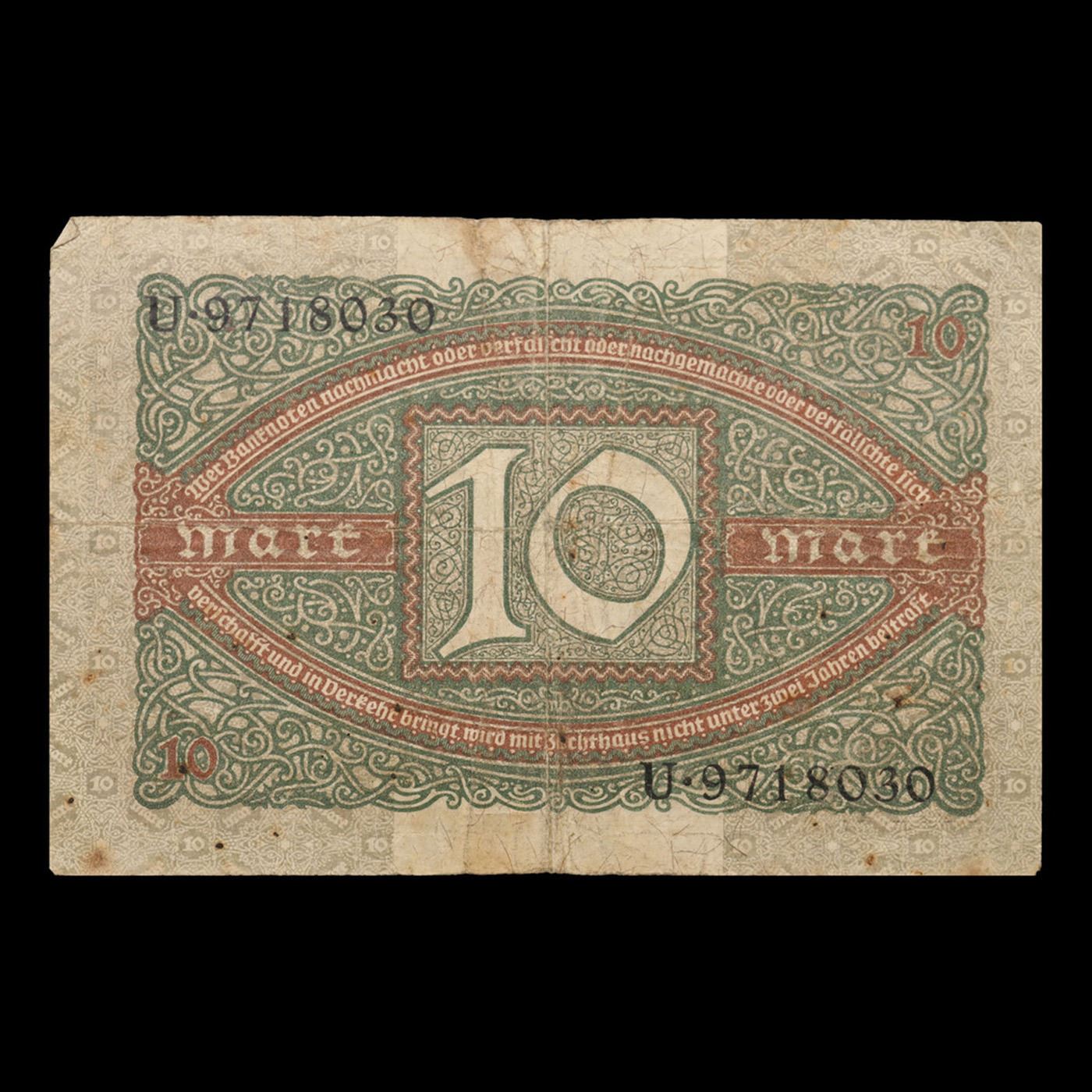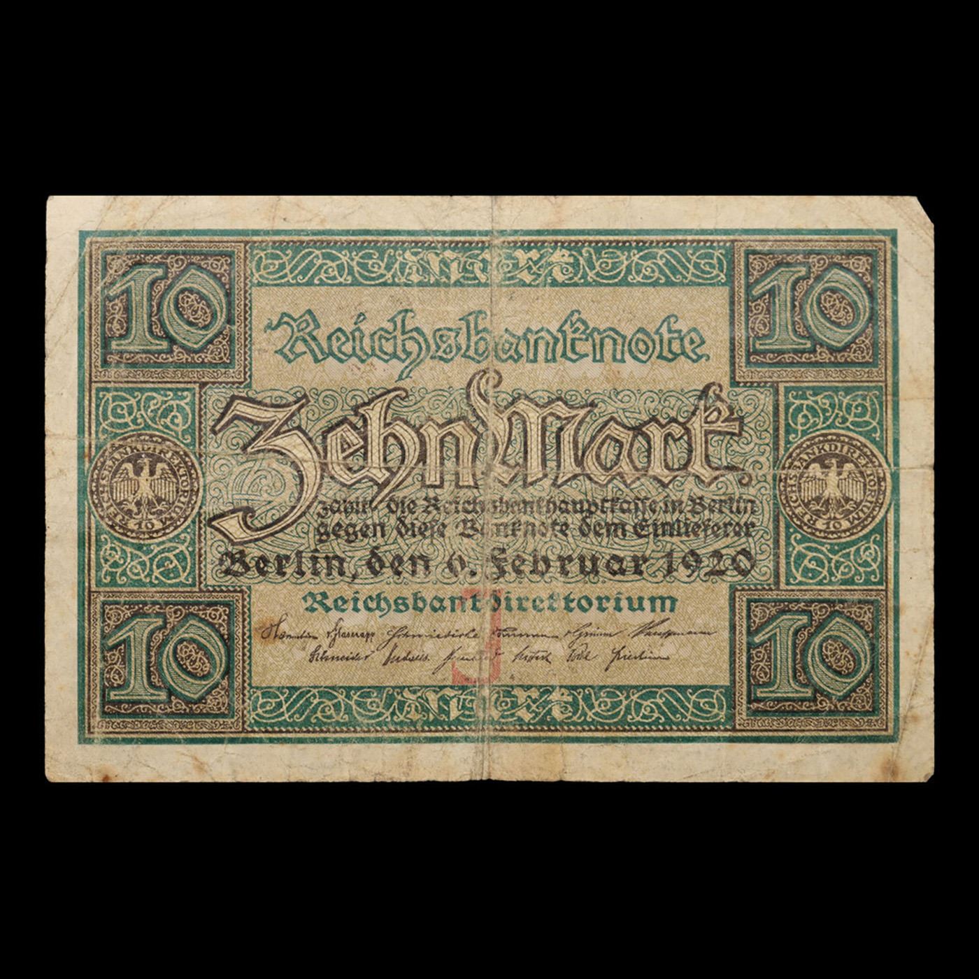 1920 Germany (Weimar) 10 Marks Banknote P# 67a Grades vf+. In August 1914, Directly after the onset of WW1, the German Empire removed the gold backing of the mark and issued new currency. After the fall of the German Empire in 1918, the newly formed German Weimar Republic issued another new currency, known derisively as the "Paper Mark", which faced massive hyperinflation.