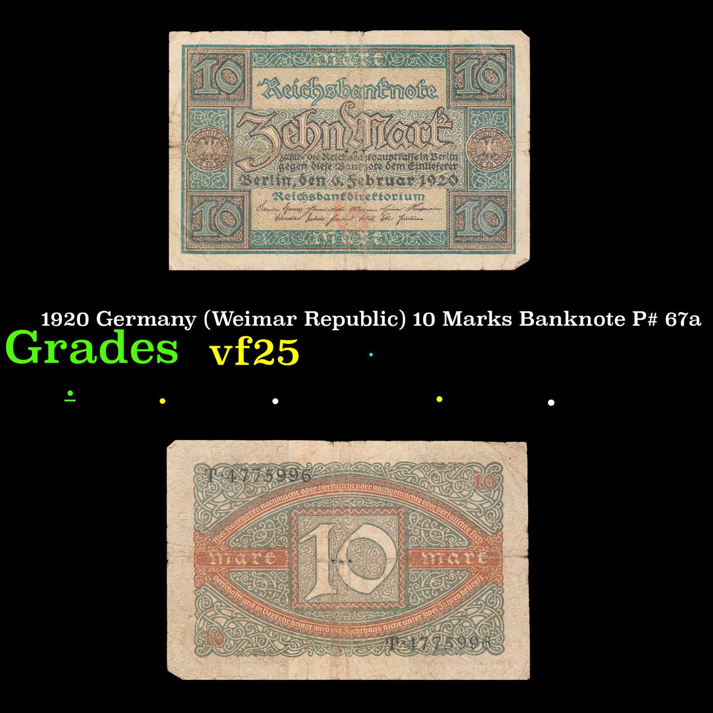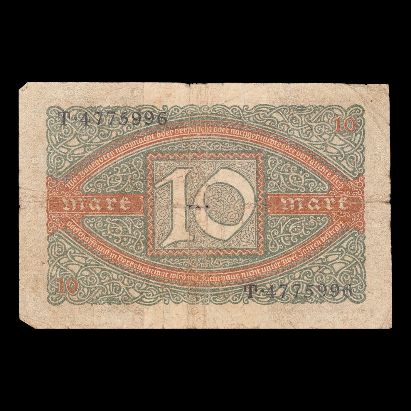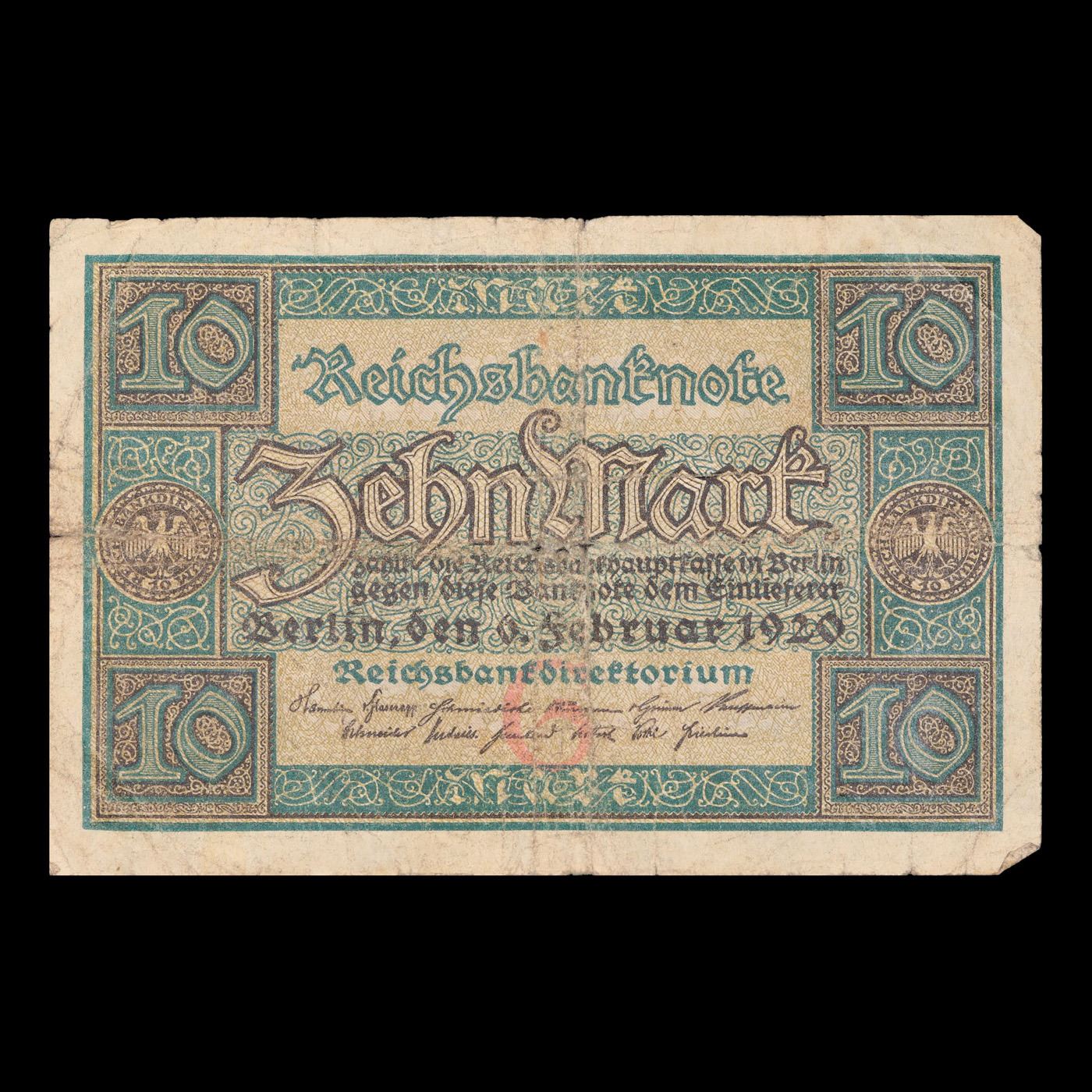 1920 Germany (Weimar Republic) 10 Marks Banknote P# 67a Grades vf+. In August 1914, Directly after the onset of WW1, the German Empire removed the gold backing of the mark and issued new currency. After the fall of the German Empire in 1918, the newly formed German Weimar Republic issued another new currency, known derisively as the "Paper Mark", which faced massive hyperinflation.