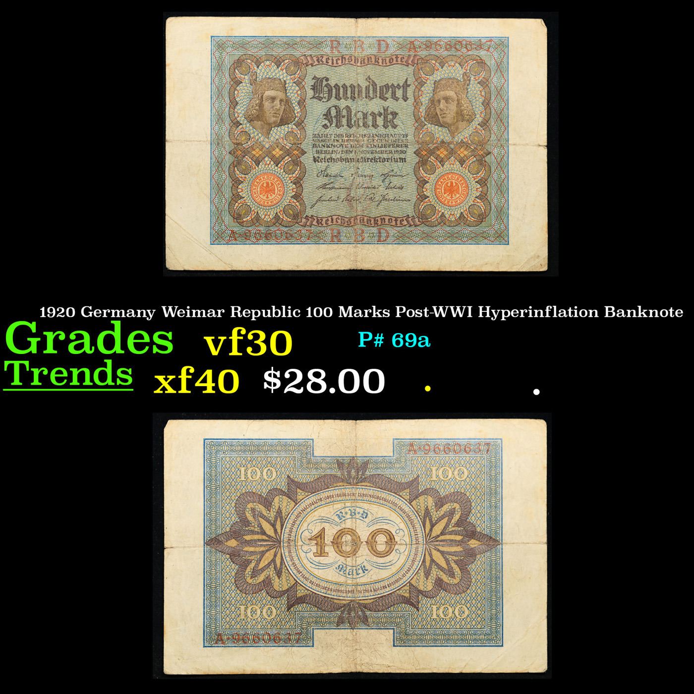 1920 Germany Weimar Republic 100 Marks Post-WWI Hyperinflation Banknote Grades vf++. In the early 1920s, post-WWI Germany saw its economy spiraling out of control. Hyperinflation started directly after the war in 1918, but truly took over the Weimar Republic from 1921 to 1923. The value of the Mark declined incredibly rapidly. 1 USD was equal to 50 German Marks at the beginning of 1920. Toward the end of 1923, 1 USD was equal to over 4,200,000,000,000 German Marks. At times, denominations of the Mark became less valuable than the paper and labor to print it almost immediately after printing. Thus, denominations of the Mark notes became incredibly large, ending up in the tens of trillions.