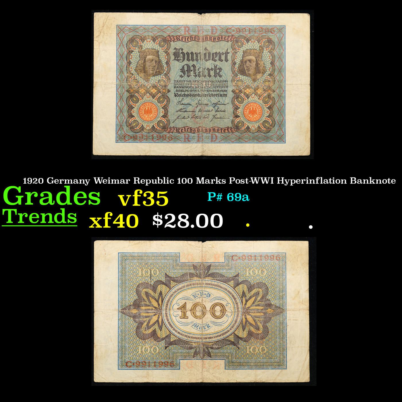 1920 Germany Weimar Republic 100 Marks Post-WWI Hyperinflation Banknote Grades vf++. In the early 1920s, post-WWI Germany saw its economy spiraling out of control. Hyperinflation started directly after the war in 1918, but truly took over the Weimar Republic from 1921 to 1923. The value of the Mark declined incredibly rapidly. 1 USD was equal to 50 German Marks at the beginning of 1920. Toward the end of 1923, 1 USD was equal to over 4,200,000,000,000 German Marks. At times, denominations of the Mark became less valuable than the paper and labor to print it almost immediately after printing. Thus, denominations of the Mark notes became incredibly large, ending up in the tens of trillions.