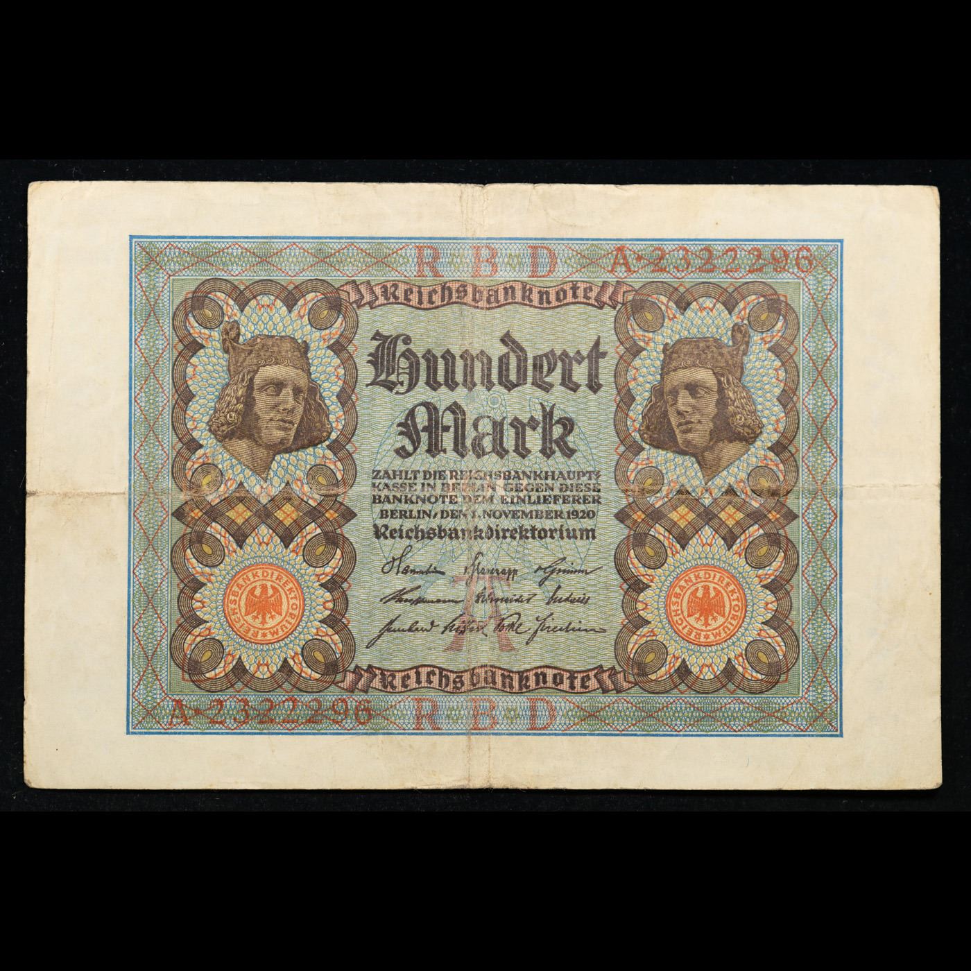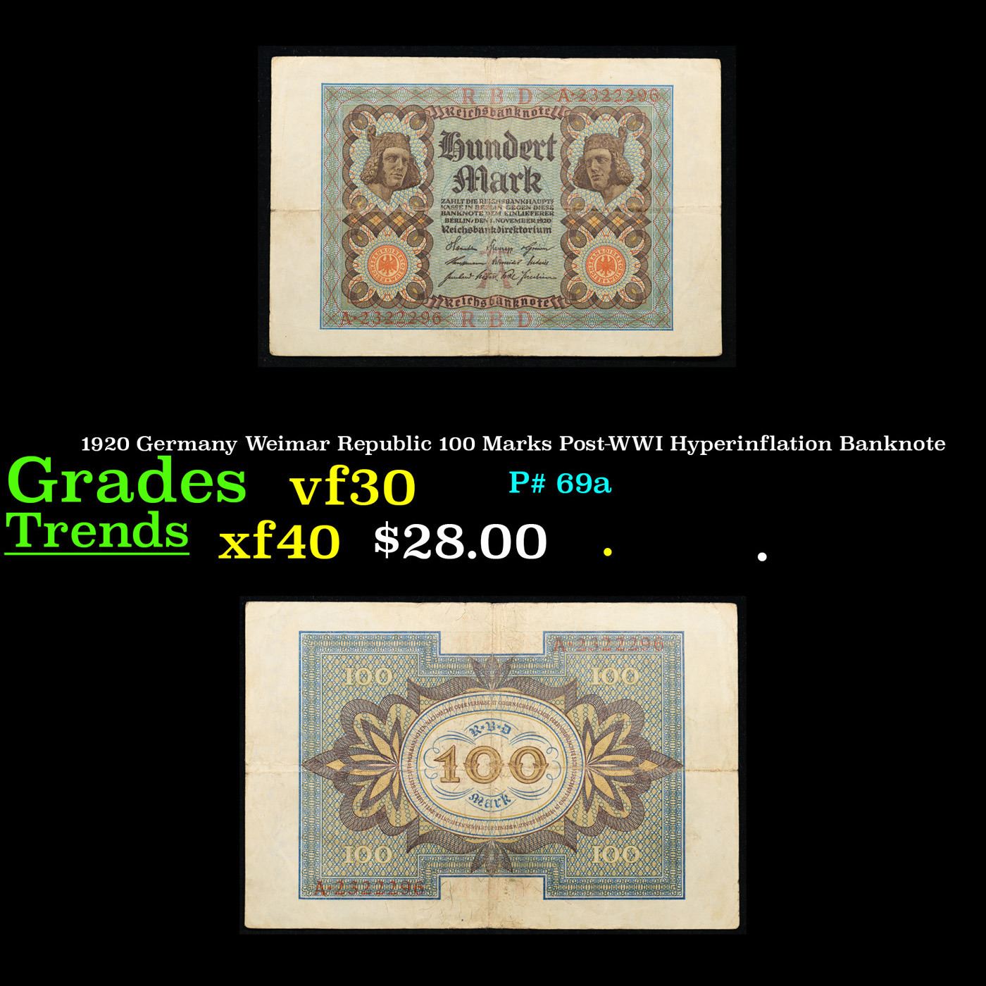 1920 Germany Weimar Republic 100 Marks Post-WWI Hyperinflation Banknote Grades vf++. In the early 1920s, post-WWI Germany saw its economy spiraling out of control. Hyperinflation started directly after the war in 1918, but truly took over the Weimar Republic from 1921 to 1923. The value of the Mark declined incredibly rapidly. 1 USD was equal to 50 German Marks at the beginning of 1920. Toward the end of 1923, 1 USD was equal to over 4,200,000,000,000 German Marks. At times, denominations of the Mark became less valuable than the paper and labor to print it almost immediately after printing. Thus, denominations of the Mark notes became incredibly large, ending up in the tens of trillions.