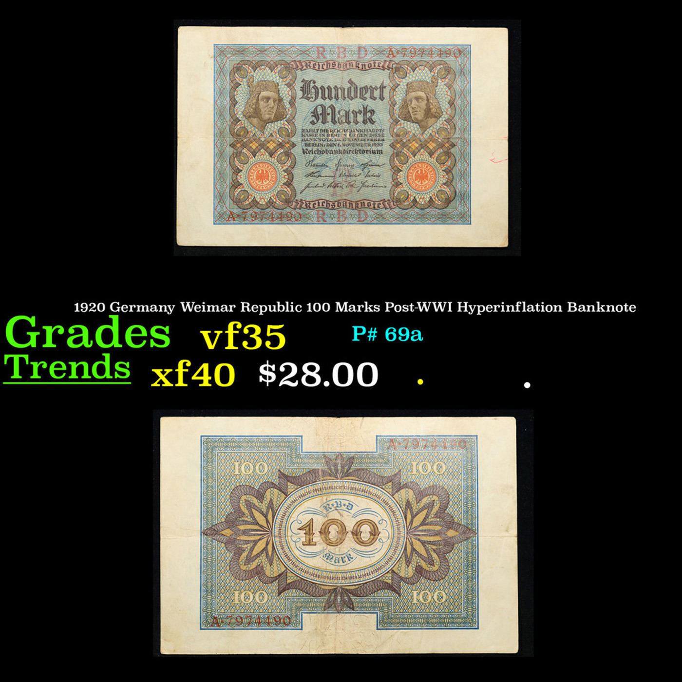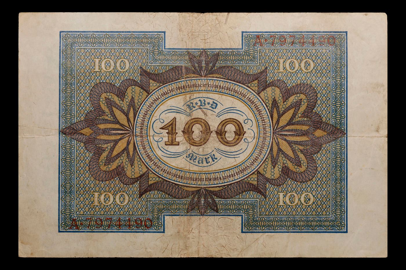 1920 Germany Weimar Republic 100 Marks Post-WWI Hyperinflation Banknote Grades vf++. In the early 1920s, post-WWI Germany saw its economy spiraling out of control. Hyperinflation started directly after the war in 1918, but truly took over the Weimar Republic from 1921 to 1923. The value of the Mark declined incredibly rapidly. 1 USD was equal to 50 German Marks at the beginning of 1920. Toward the end of 1923, 1 USD was equal to over 4,200,000,000,000 German Marks. At times, denominations of the Mark became less valuable than the paper and labor to print it almost immediately after printing. Thus, denominations of the Mark notes became incredibly large, ending up in the tens of trillions.