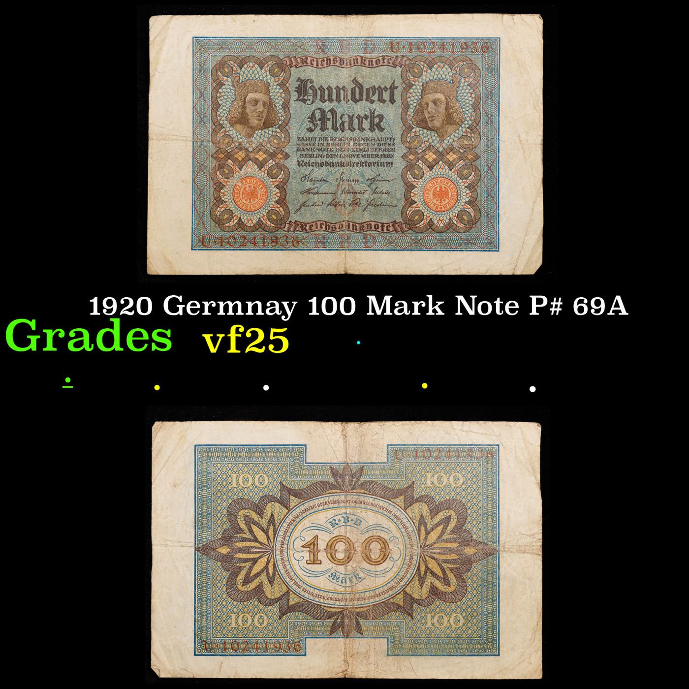 1920 Germnay 100 Mark Note P# 69A Grades vf+.