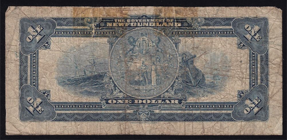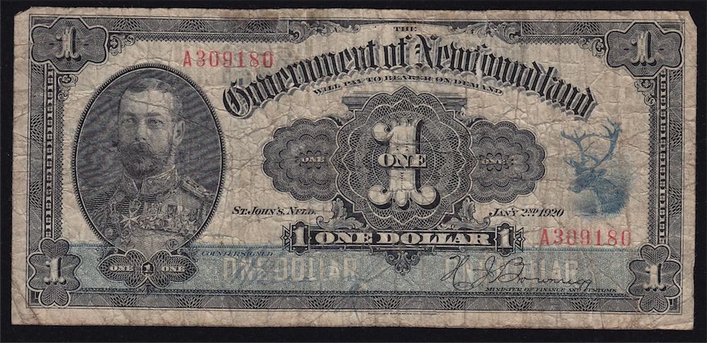1920 Government of Newfoundland $1 - CH NF-12d VG, pinholes at the top, tape repairs on back top. S/N:A309180.