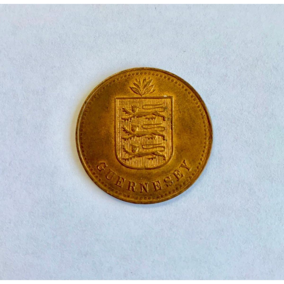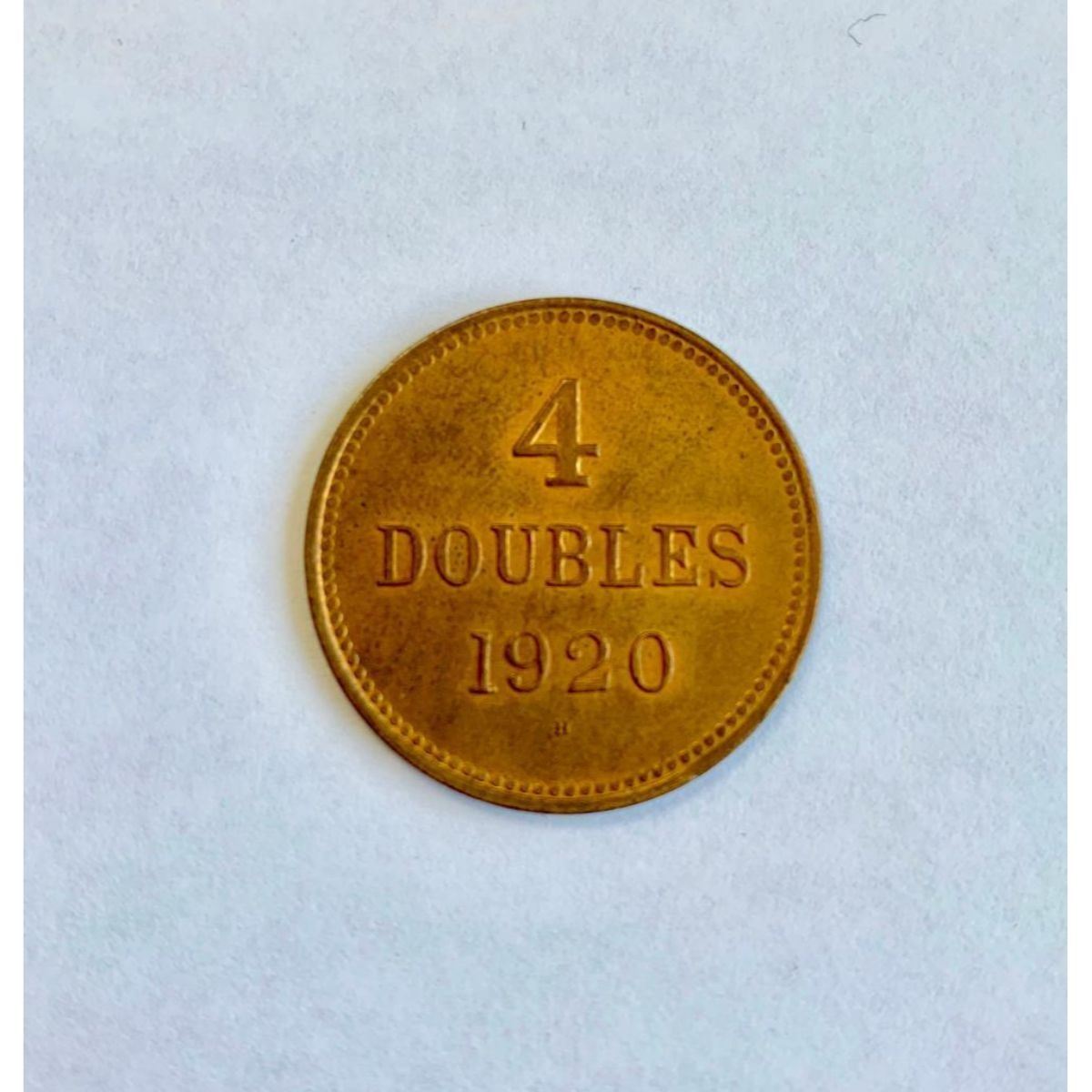 Obverse National arms Lettering: GUERNESEY Reverse Value and date Lettering: 4 DOUBLES 1945 Edge Plain Country: Guernsey Type: Standard circulation coin Years: 1914-1949 Value: 4 Doubles (1/480) Currency: Pound (1827-1971) Composition: Bronze Weight: 4.8 g Diameter: 26.4 mm Thickness: 1.26 mm Shape: Round