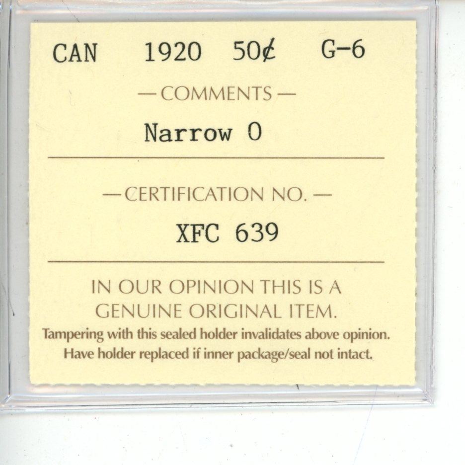 1920 ICCS Graded - Canadian Fifty Cent - Narrow 0 - G6