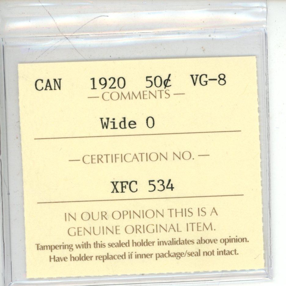 1920 ICCS Graded - Canadian Fifty Cent - Wide 0 - VG8