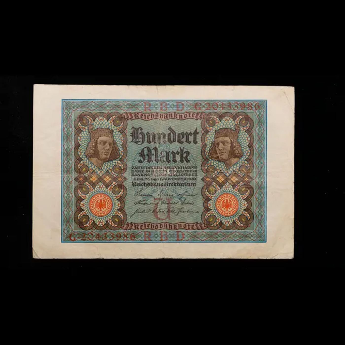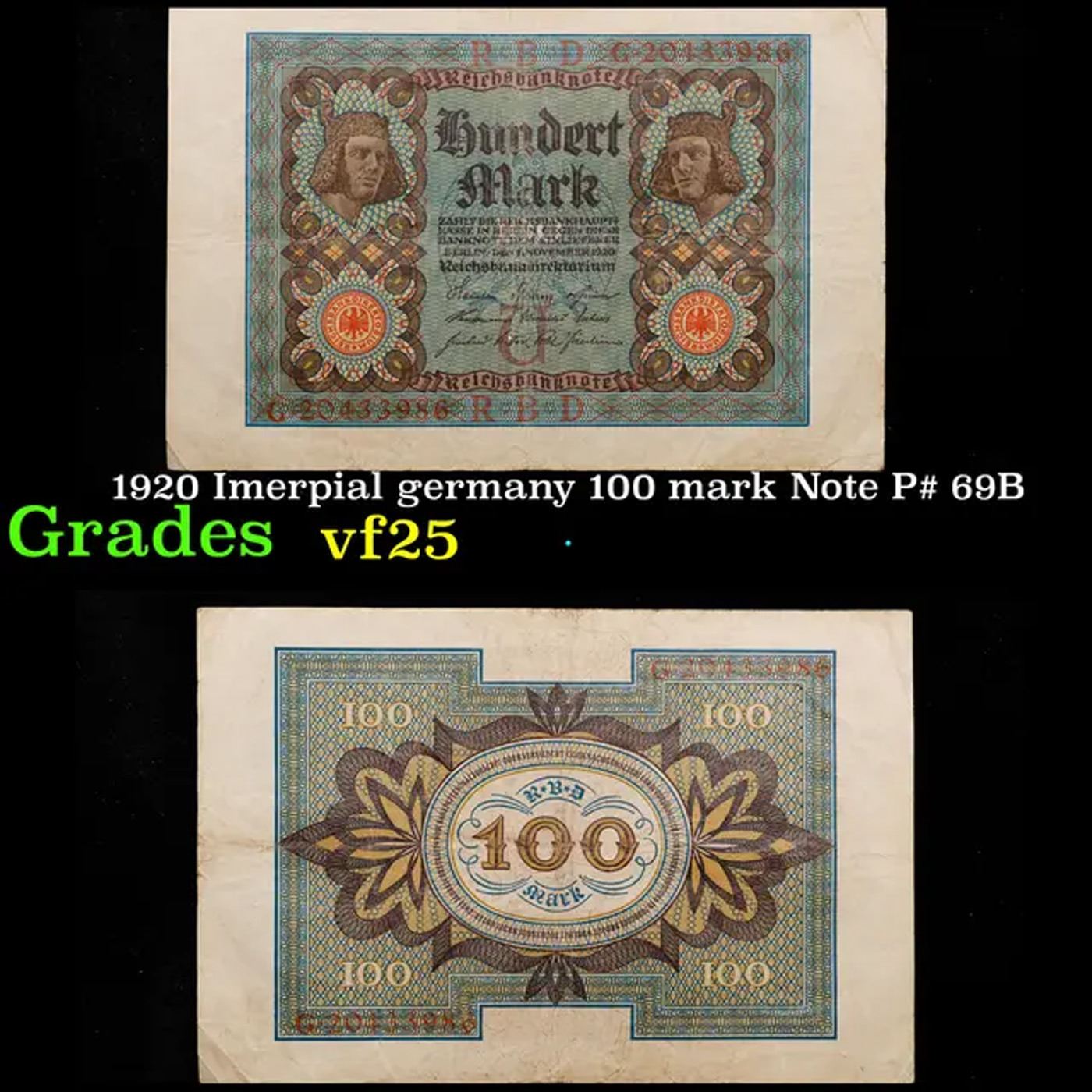 1920 Imerpial Germany 100 mark Note P# 69B Grades vf+. Notgeld is German for "emergency/necessity money". Notgeld typically refers to German and Austrian notes produced in the post-WWI period. Somewhat similar to Depression Scrip in the USA, these notes were issued when there wasn'te nough state-produced money available from the central bank. Issuing institutions were often a town's savings banks, municipalities, or private or state-owned firms. Nearly all issues contained an expiry date, after which time they were invalid. Issues without dates ordinarily had an expiry announced in a newspaper or at the place of issuance.