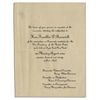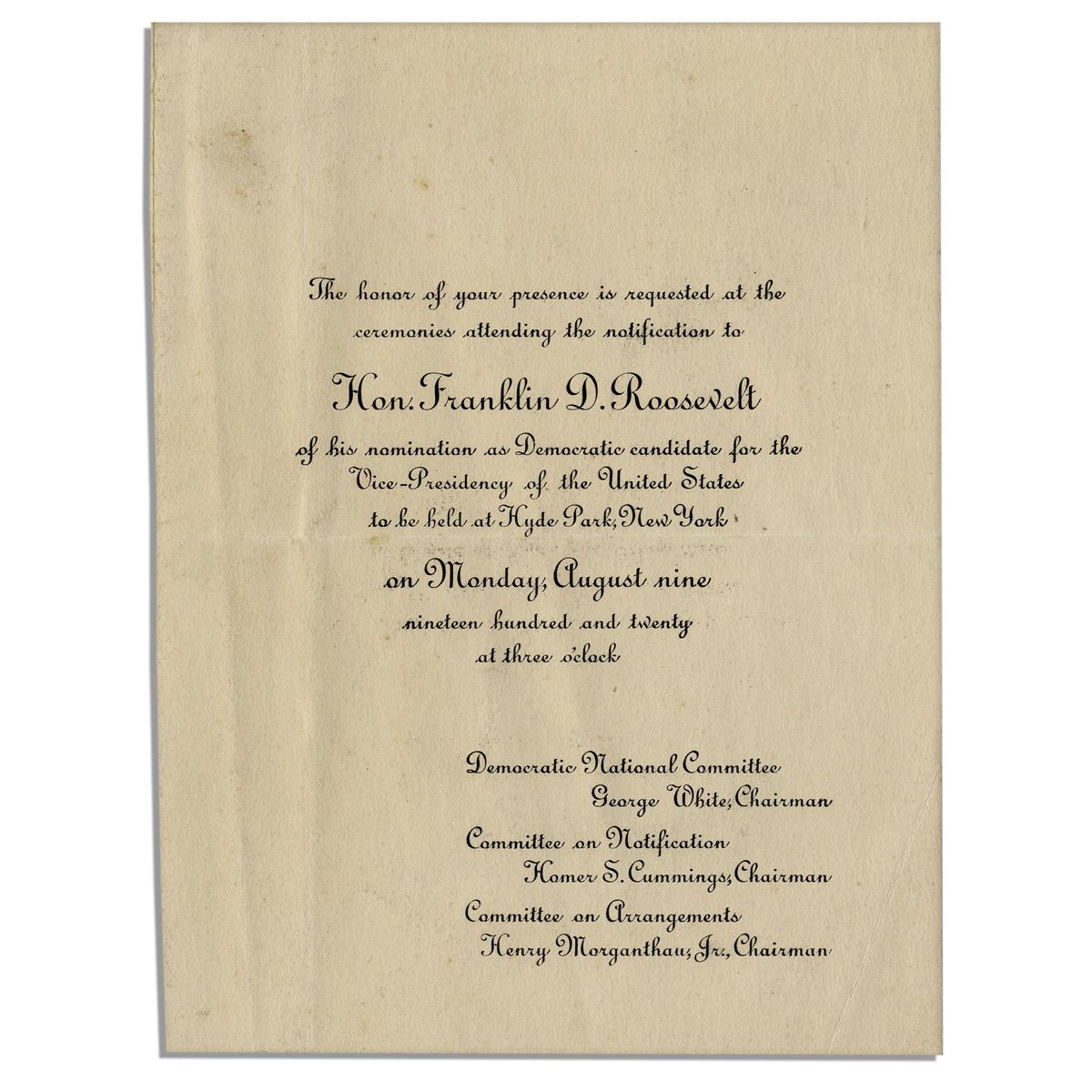 Franklin D. Roosevelt invitation to his vice-presidential nomination ceremony, held 9 August 1920 in Hyde Park, New York. Printed invitation reads in part, ''The honor of your presence is requested at the ceremonies attending the notification to Hon. Franklin D. Roosevelt of his nomination as Democratic candidate for the Vice-Presidency of the United States''. Single-page invitation measures 5.75'' x 7.5''. Toning and creasing, else near fine.
