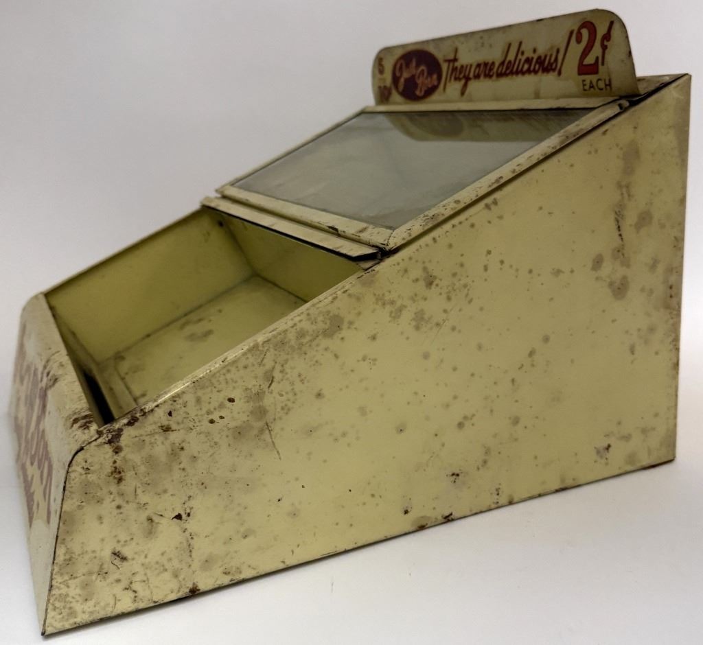 Item/Description: Featuring an antique 1920 Just Born "Quality Chocolates" metal and glass general store over the counter candy display case from Brooklyn, NY, USA. (Vintage Advertising, Americana)