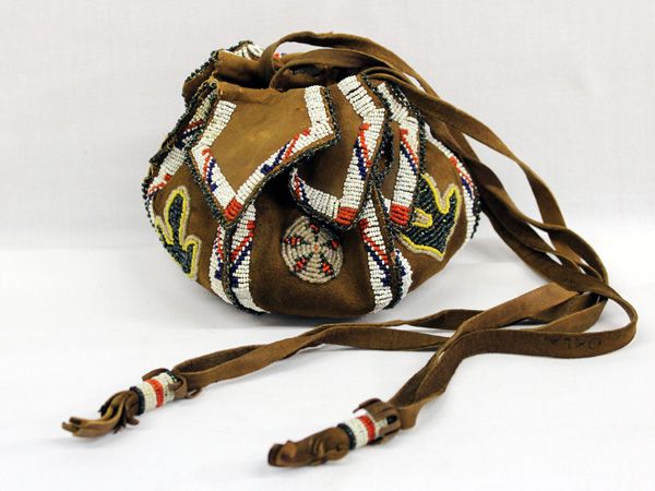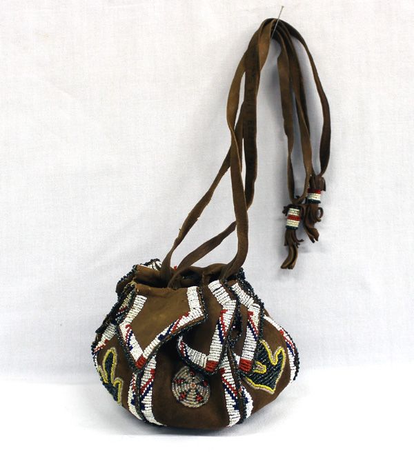 1920 Kiowa/Apache Beaded Hide Bag. Written on the inside of the strap of this sweet little bag is ''May 31 1923 Ethel Samuel Watonga Oklahoma.'' Suede bag measures approx. 4.5''h x 6.5''W.