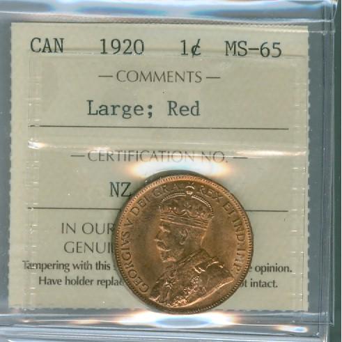 1920 Large 1¢ ICCS MS65 Red, attactive and fully lustrous 90
