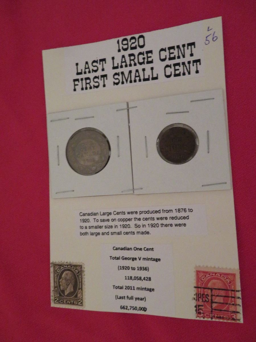 1920 Last year for Canadian large cents and first year for the small cent both coin on display card